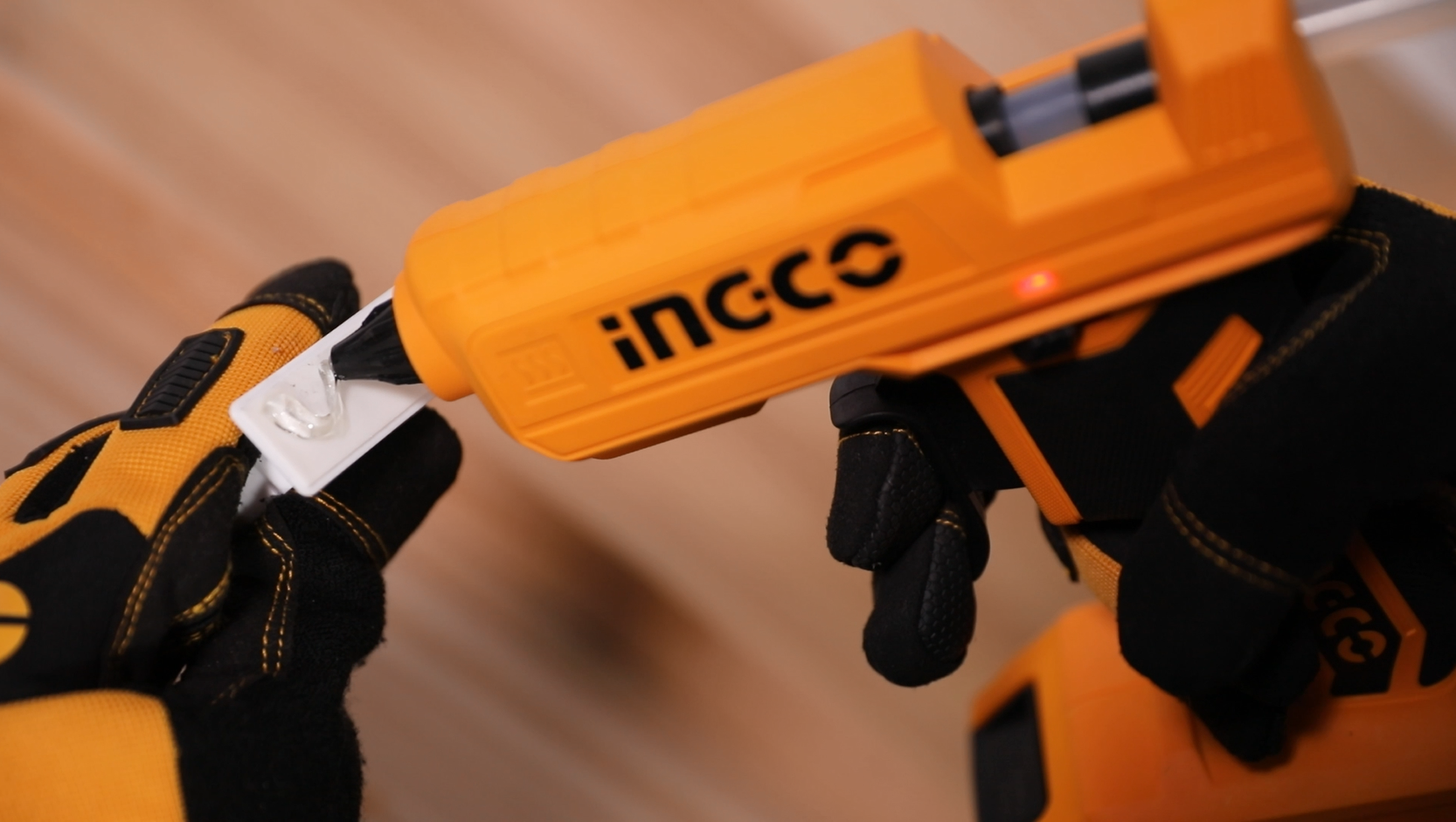 قم بتوصيل المسدس واتركه يسخن لمدة 5 دقائق تقريبًا، ثم اضغط برفق على الزناد لتوزيع كمية صغيرة من الغراء على قطعة اختبار.