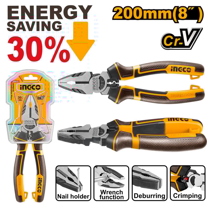 37.98Size: 8"/200mm Energy saving 30% than normal pliers Material: Cr-V Surface treatment: black finish and polish TPR three color handle for strong grip and comfort With crimping function With nail holder function With spanner function With deburring function Packed by half double blister