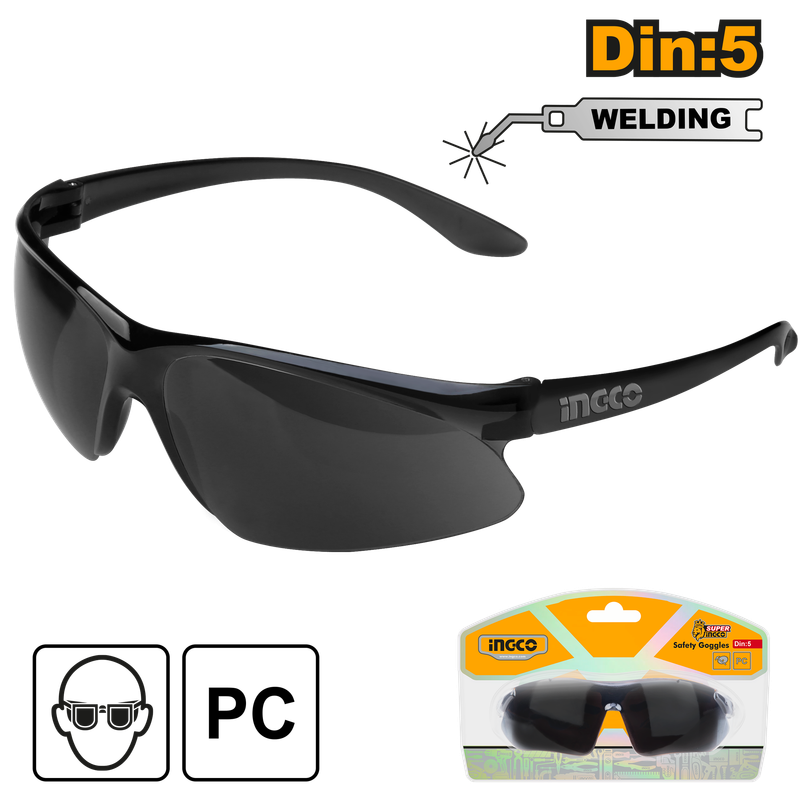 Material:PC Dark shade:5 Use for welding Economical wrap around style Light weight,comfortable to wear,wide visual field Indoor and outdoor lenses Packed by double blister